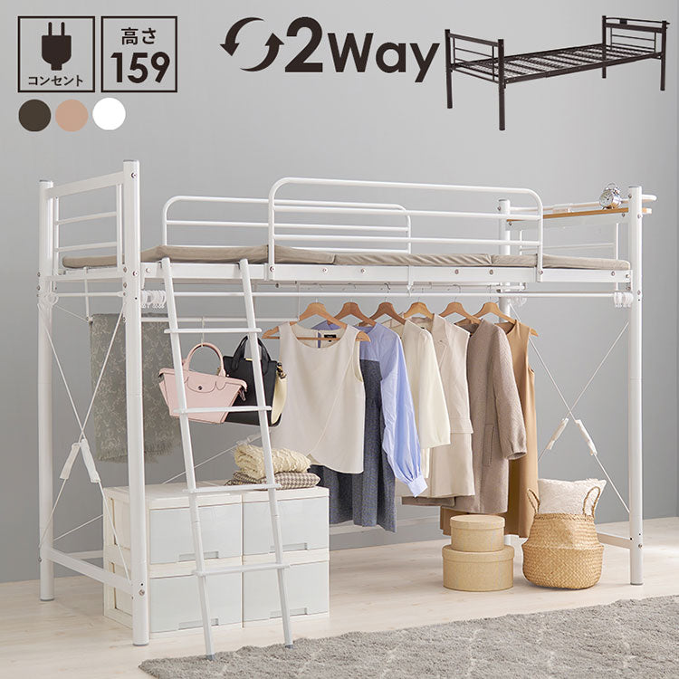 ロフトベッド 高さ159cm 棚コンセント付き シングル ミドルタイプ 耐荷重100kg システムベッド 収納 ハンガー パイプベッド 宮棚付き ベッドフレーム はしご 一人暮らし(代引不可)