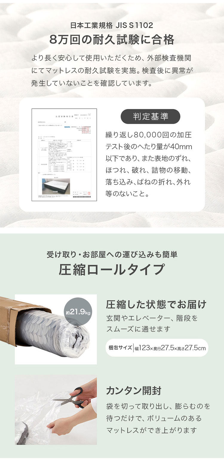 体型に沿うように点で支え、体圧を分散するポケットコイルマットレス。圧縮ロールタイプ。ダブルサイズ