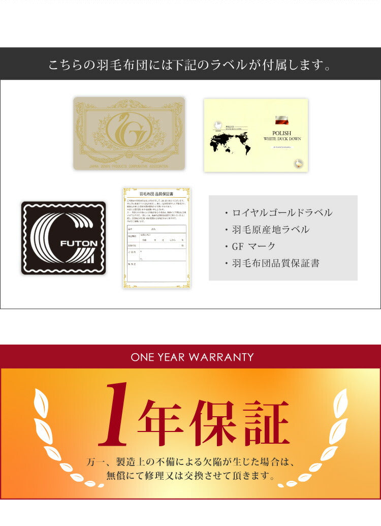※羽毛は天然素材のため、無臭ではございません。原毛は洗浄を十分に行っておりますが、開梱直後や温度・湿度等の環境等により臭いを感じる場合がございますので、開封直後には風通しの良い場所での十分な陰干し等をお勧めいたします。なお、天然羽毛の臭いのため人体に害はございませんのでご安心ください。