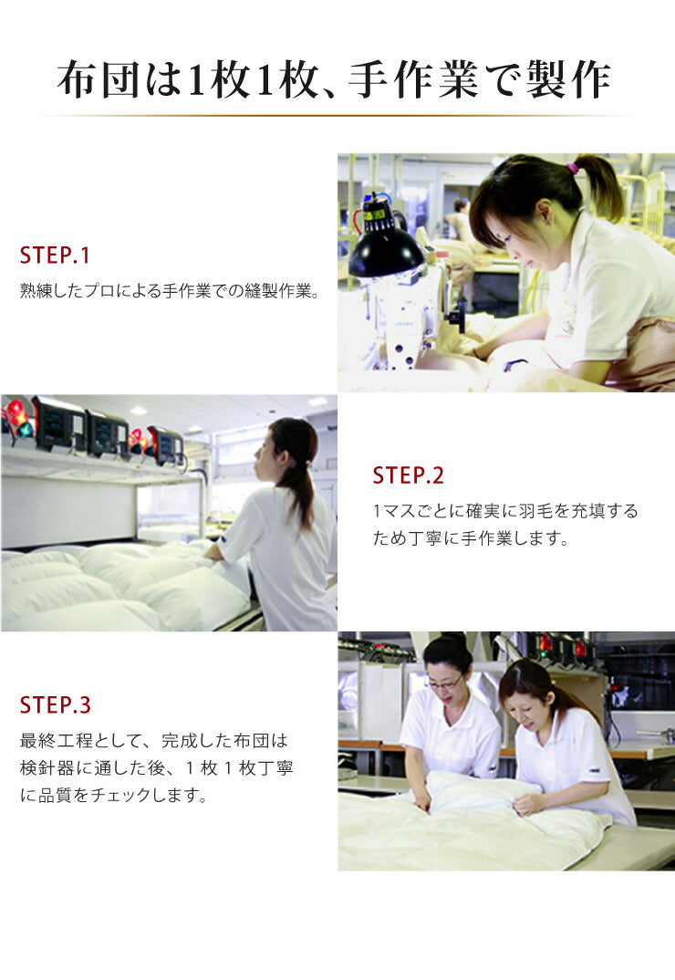 羽毛は天然素材となりますため、開封時に天然羽毛の臭いがする場合があります。(人体に害はございません。)