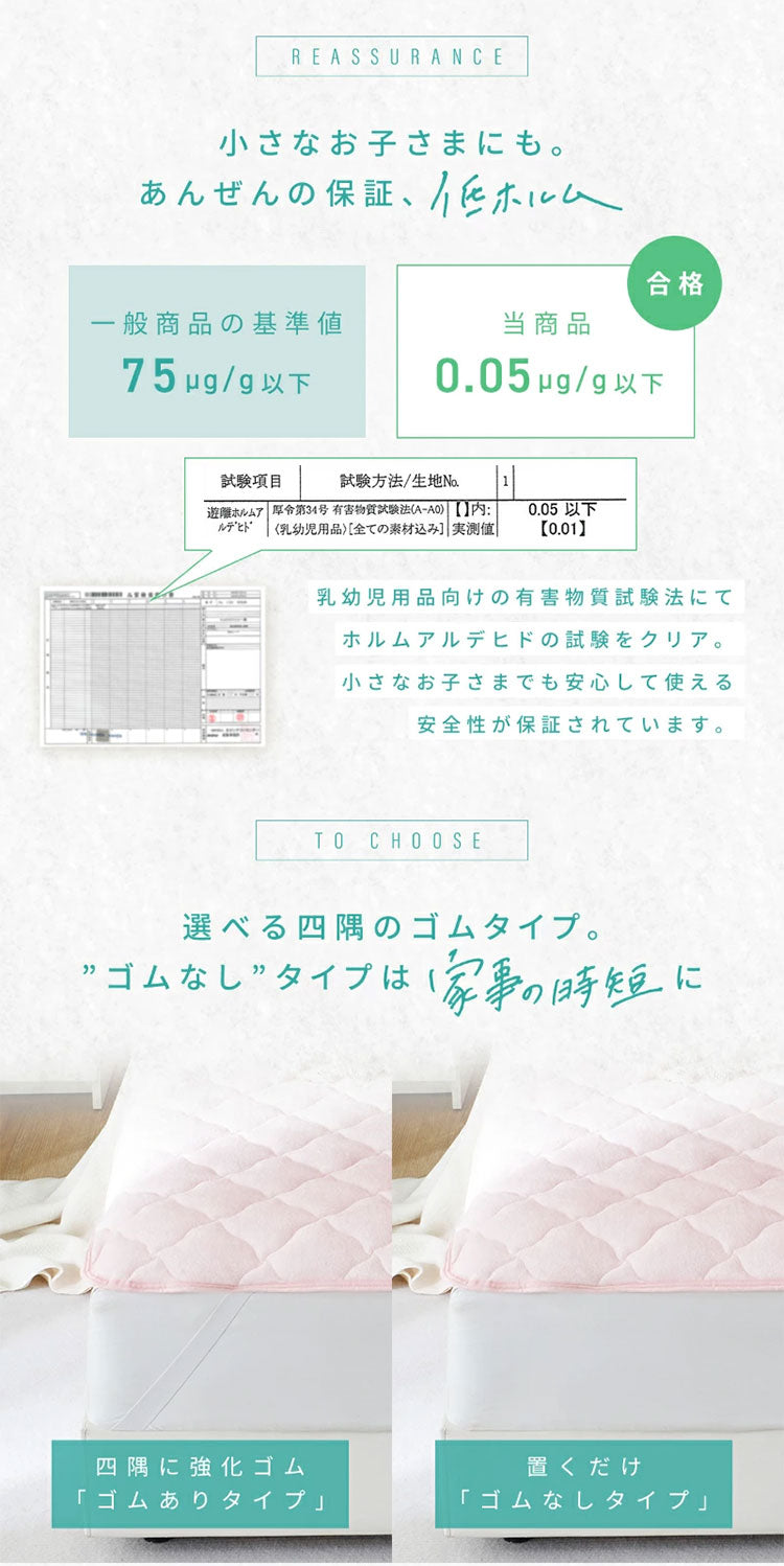 乳幼児用品向けの有害物質試験法にてホルムアルデヒドの試験をクリア。