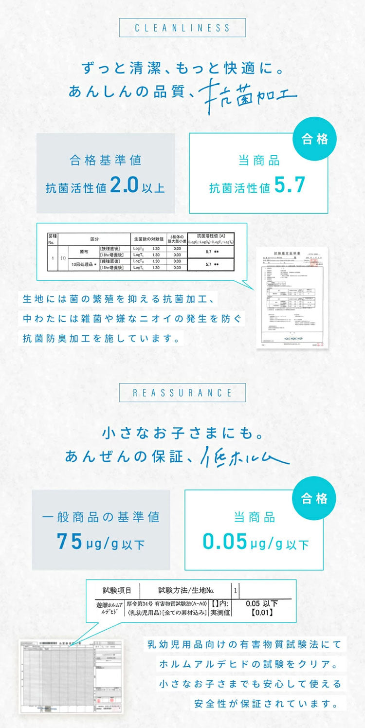 乳幼児用品向けの有害物質試験法にてホルムアルデヒドの試験をクリア。