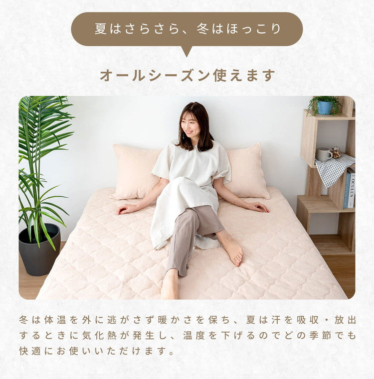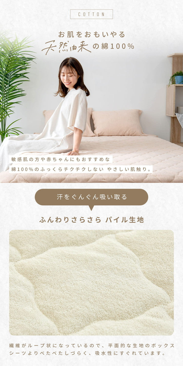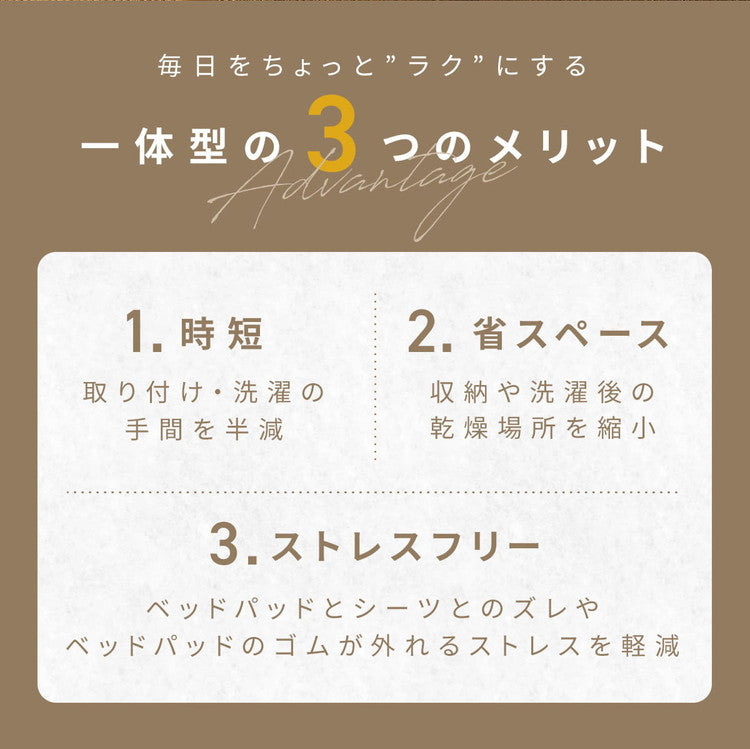 敷きパッドとベッドパッドが合体した 手軽で便利な一体型ボックスシーツ。