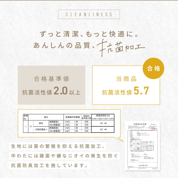 生地には菌の繁殖を抑える抗菌加工、中わたには雑菌や嫌なニオイの発生を防ぐ