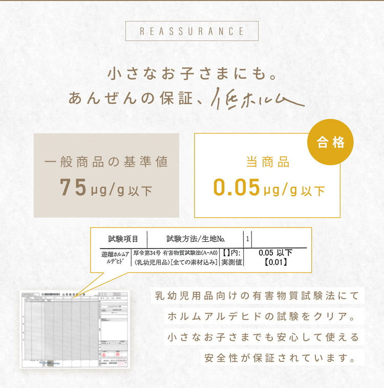 乳幼児用品向けの有害物質試験法にてホルムアルデヒドの試験をクリア。