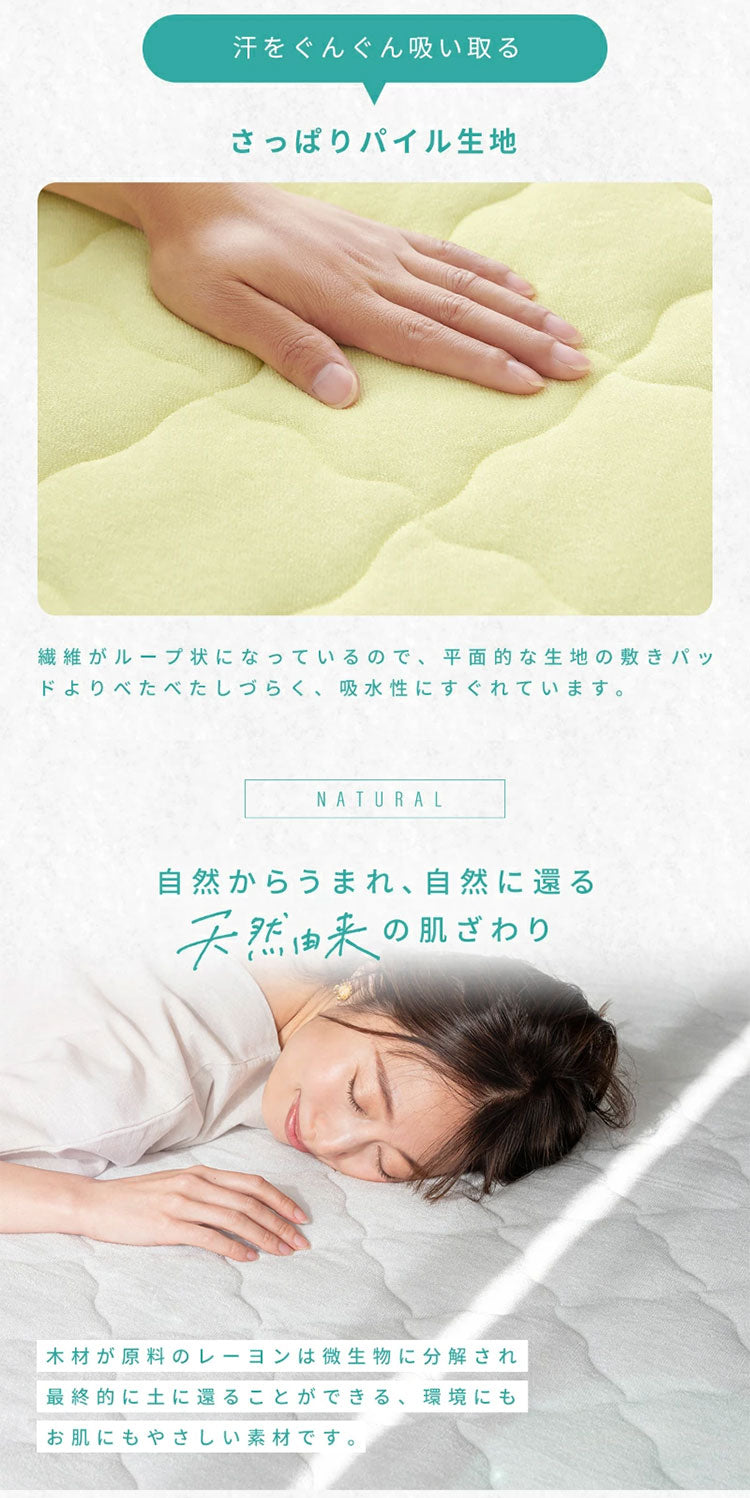 レーヨンは熱伝導が高いので寝返りをうつたび、ほんのりと涼しい素材です。